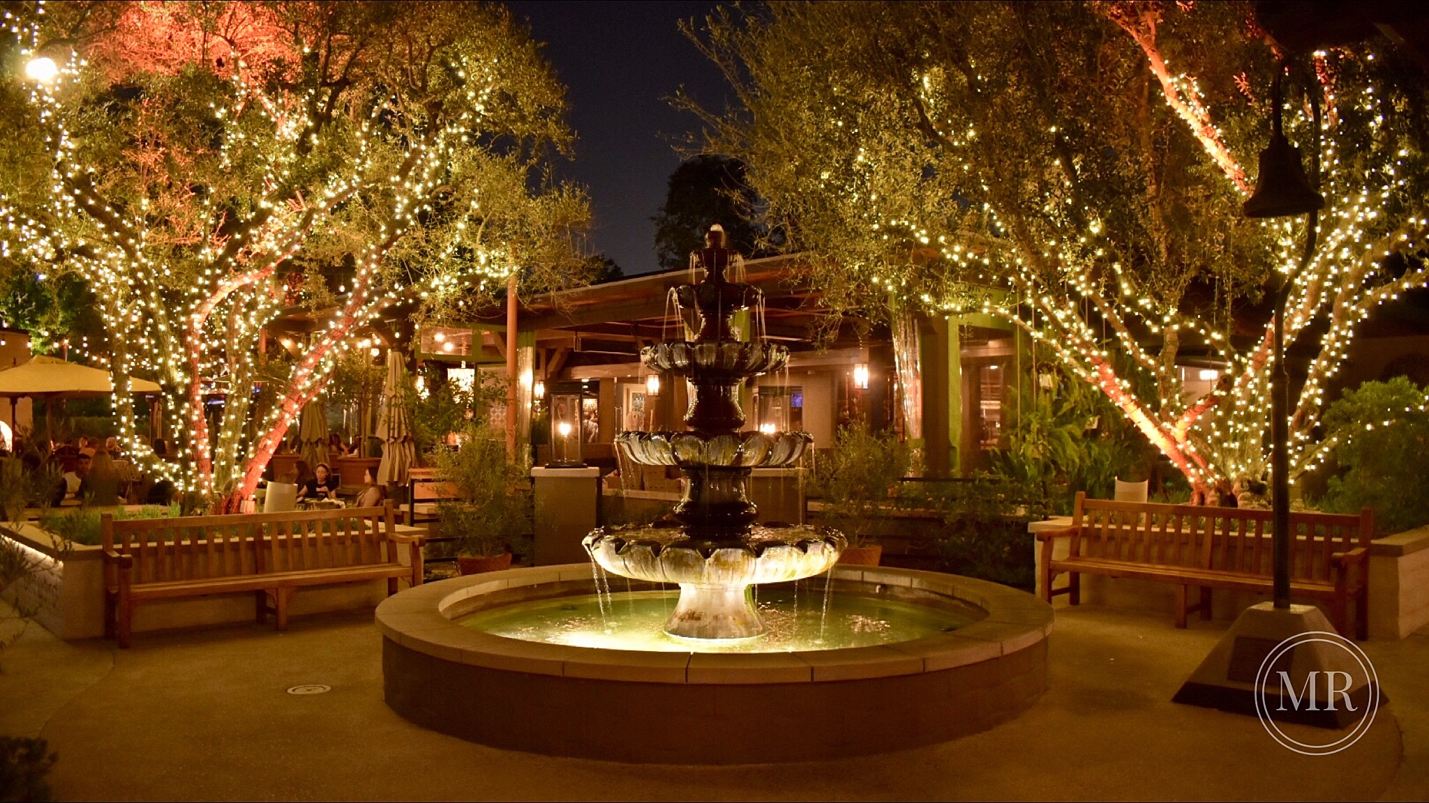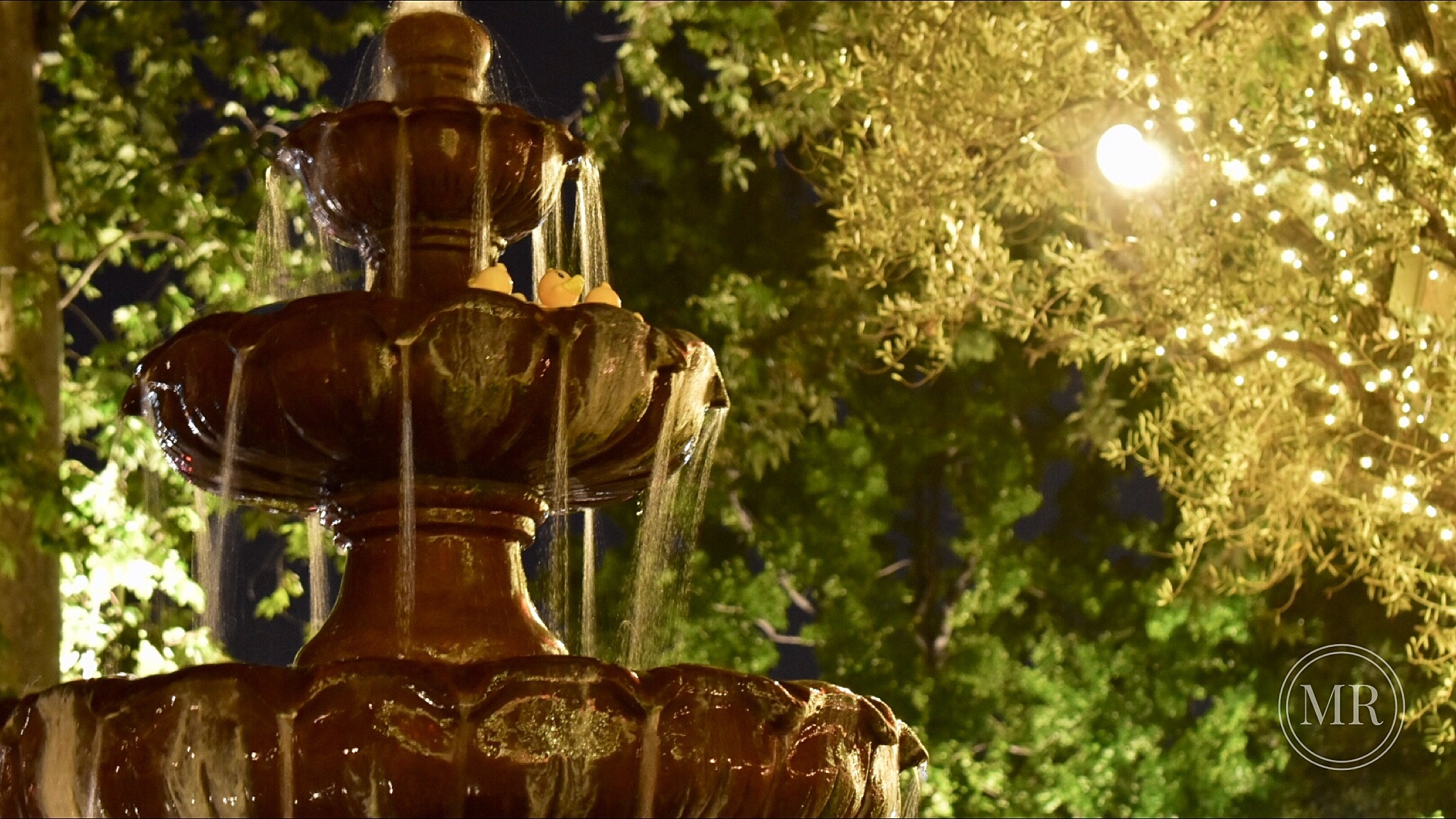 We like to sit on the bench to the right, surrounded by lights, and enjoy the sound of the water falling in front of us. In a way, this is how we get nature in the city — with a dash of magic.