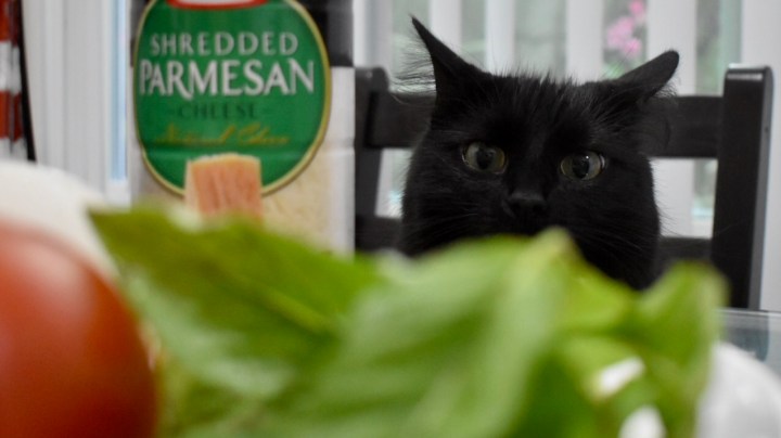 I am looking at my fresh basil, succulent Roma tomato, and spicy jalapeno, and I feel good about what’s in my metaphorical basket. I am ready when suddenly, in an unprecedented turn of events, a new judge emerges from behind the scenes, right in the middle of the competition — a first in Master Chef. Introducing for the first time, our beloved third member of the family, Bagheera.